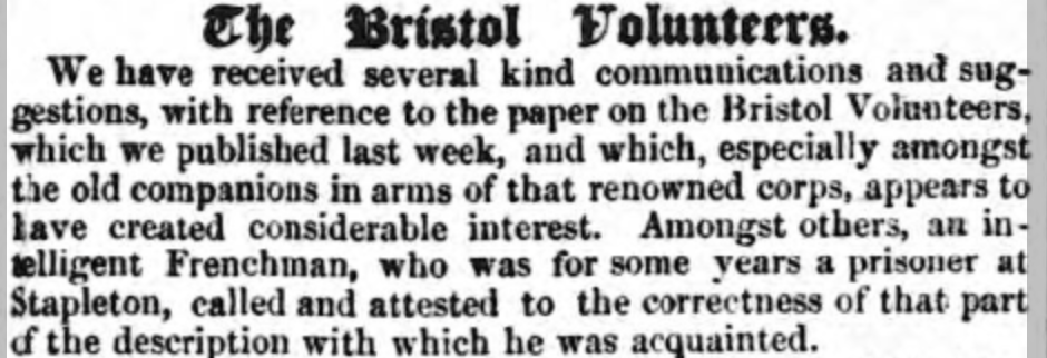 Nonetheless we have here a man born at an appropriate time to fight in the Napoleonic Wars in “Foreign Parts”, with a name that could well be French. I looked at the records of French prisoners admitted to Stapleton prison which are indexed on the National Archives’ website, and the possibilities are so many as to be comical, so I wrote that avenue off until I had learned more about his later life in Bristol.